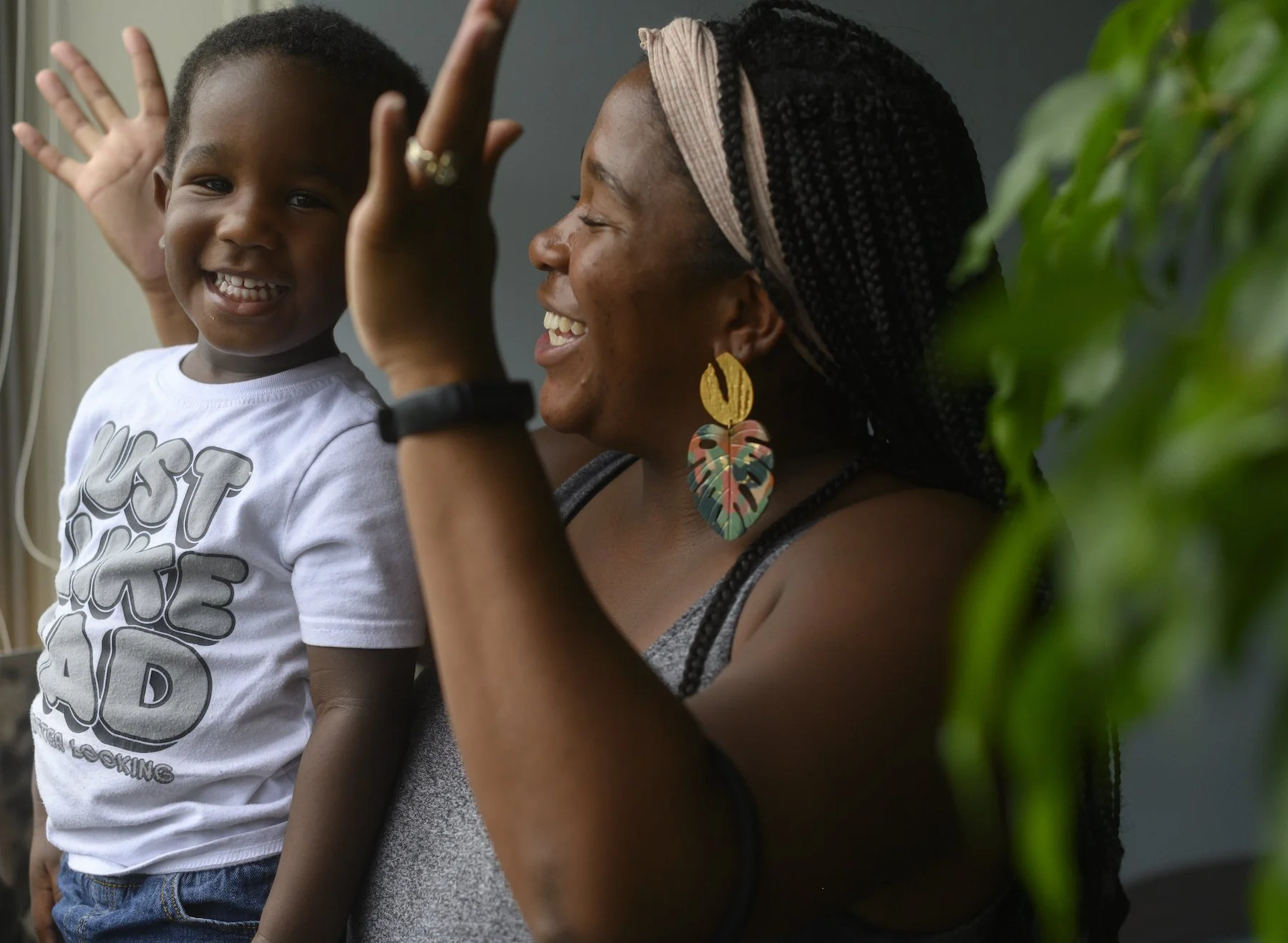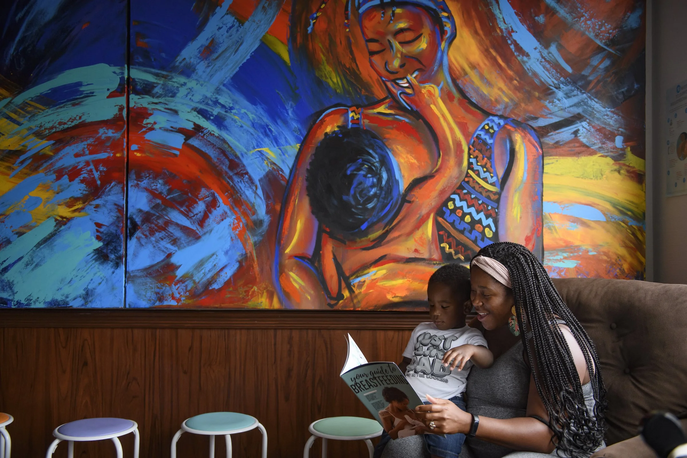 Chaundra Cunningham with her 2-year-old son, Tre’, read a book about breast feeding and infant health at the Healthy Start offices in Pittsburgh. Chaundra is an outreach director and educator at Healthy Start.